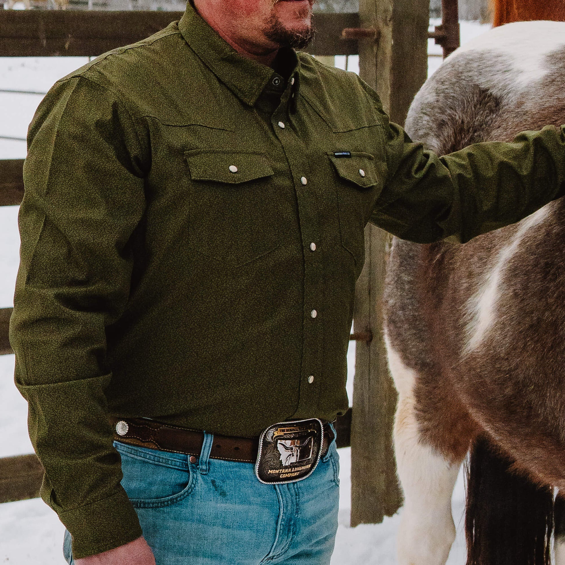 MAIN STREET PEARL SNAP LONG SLEEVE - OLIVE KNIFE PRINT